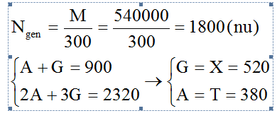 Ví dụ 2: Một gen có khối lượng 540000 đvC và có 2320 liên kết hiđrô. Tính số lượng từng loại nuclêôtít của gen.