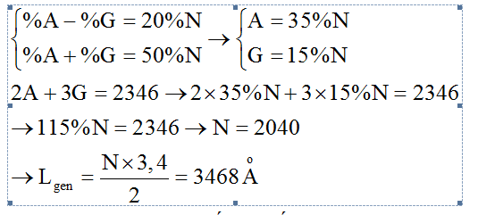 | Ví dụ 3: Một gen có 2346 liên kết hiđrô. Hiệu số giữa Ađênin của gen với một loại nuclêôtit khác bằng 20% tổng số nuclêôtit của gen đó. Tính chiều dài của gen. |