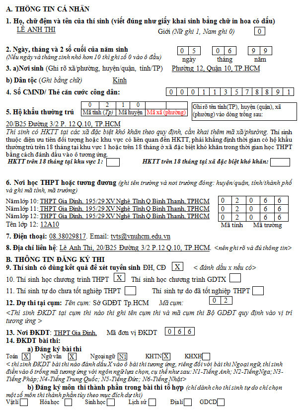 Lưu ý: Thí sinh phải ghi phiếu đăng ký dự thi đầy đủ, rõ ràng, sạch sẽ vào các mục theo yêu cầu và không sửa chữa, tẩy xoá. Nếu là số, ghi bằng chữ số Ả rập (0, 1, 2, 3…), không ghi bằng chữ số La mã (I, V, X…).