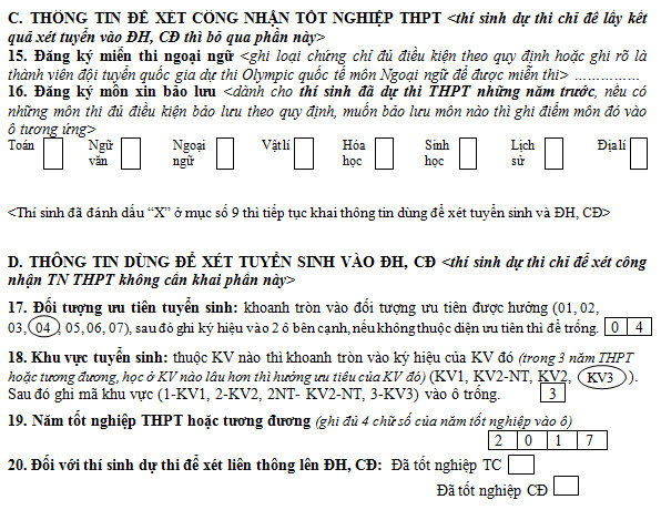 | 20. Đối với thí sinh dự thi để xét liên thông lên ĐH, CĐ | Đối với thí sinh thi với mục đích lấy kết quả để xét học liên thông lên cao đẳng, đại học cần đánh dấu (X) vào ô đã tốt nghiệp ở bậc học nào tương ứng: Đã tốt nghiệp trung cấp (TC) hoặc Đã tốt nghiệp cao đẳng (CĐ). |