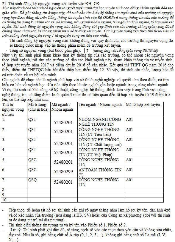 Mục này dành cho thí sinh có nguyện vọng xét tuyển sinh đại học; tuyển sinh cao đẳng nhóm ngành đào tạo giáo viên. Để ghi thông tin ở mục này, thí sinh cần tìm hiểu kỹ thông tin tuyển sinh của trường có nguyện vọng học được đăng tải trên Cổng thông tin tuyển sinh của Bộ GD&ĐT và trang thông tin của các trường để có thông tin đăng ký chính xác về mã trường, mã ngành/nhóm ngành, tên ngành/nhóm ngành, tổ hợp môn xét tuyển. Các thí sinh lưu ý mã ngành đại học năm nay sẽ là 7, năm trước bắt đầu là 52.Các em lưu ý để ghi mã ngành chính xác. Thí sinh đăng ký nguyện vọng nào không đúng với quy định của các trường thì nguyện vọng đó sẽ không được nhập vào hệ thống phần mềm để trường xét tuyển. Không có giới hạn về số nguyện vọng trong cùng một trường cũng như nhiều trường, cũng như sử dụng xét tuyển ở nhiều tổ hợp môn ( khối thi) khác nhau. Trong một trường, học sinh có thể chọn nhiều ngành hoặc nhiều tổ hợp của một ngành. Riêng các thí sinh công an và quân đội năm 2018 lưu ý muốn xét tuyển hai ngành này thì bắt buộc phải sơ tuyển, xét tuyển đúng trường đã sơ tuyển và bắt buộc đăng ký nguyện vọng 1 vào ngành trường đăng ký, còn từ nguyện vọng 2 trở đi các em có thể đăng ký bất kì trường dân sự nào. Trong đợt đầu tiên các nguyện vọng sẽ xét công bằng như nhau: Tức là dù các em có tới 20 nguyện vọng thì nguyện vọng 1 của bạn A và nguyện vọng 20 của bạn B được xét cùng lúc như sau. Tuy nhiên trường hợp của B mà đã trúng tuyển ở nguyện vọng 1 hoặc nguyện vọng nào đó trước nguyện vọng thứ 20 của B thì B không trúng tuyển dù B có cao điểm nhiều hơn A đi chăng nữa. Do vậy, các em chú ý là thứ tự nguyện vọng chỉ quyết định việc đỗ trường nào trước trường nào sau. Khi đã trúng tuyển ở các nguyện vọng đầu thì các nguyện vọng sau không được xét. Trường hợp muốn đăng ký nhiều hơn 20 nguyện vọng, em tạo thêm bảng ( dòng và cột) từ bản word trên máy tính giống như mẫu của Bộ điền tiếp vào từ nguyện vọng thứ 21. Trường hợp muốn đăng ký nguyện vọng 2 mã ngành cùng một trường, các em để 2 nguyện vọng làm 2 dòng ở mục 21 trong phiếu hồ sơ, mỗi dòng là một nguyện vọng. |