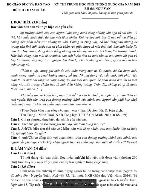 Đề minh họa thi THPT QG 2018 môn Ngữ văn