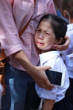 Ảnh 5: Em bé khiếm thính Thảo Nhi (Trường PTCS Xã Đàn _ Hà Nội) khóc nức nở suốt buổi khai trường vì không thấy mẹ làm nhiều người nhớ lại những ngày khai giảng thuở ấu thơ của mình đã từng khóc nức khi không thấy bố mẹ