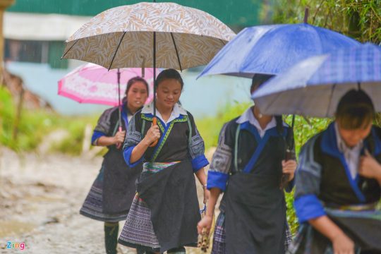 Ảnh 6: Nữ sinh trường THPT Mù Cang Chải mặc trang phục truyền thống của dân tộc mình đội mưa trong ngày tựu trường