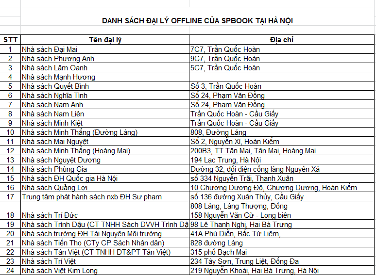 Danh sách Đại lý offline bán sách luyện thi của Spbook tại Hà Nội: