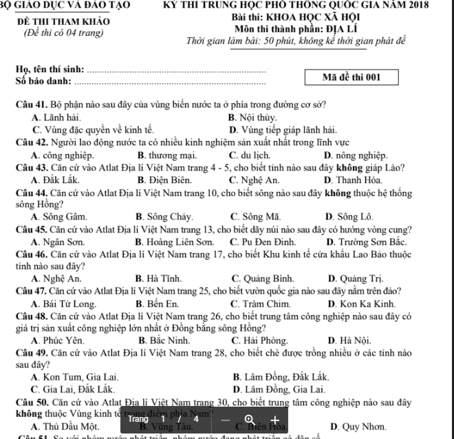 | Kĩ năng sử dụng Atlat Địa lí Việt Nam | C43, C44, C45, C46, C47, C48, C49, C50 | C57, C64 | |||