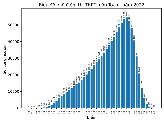 Có 1,003,372 thí sinh thi Toán, trong đó trung bình là 6,25 điểm, điểm trung vị là 6,6 điểm; điểm đạt nhiều nhất là 7,6. Số thí sinh <= 1 là 123 (chiếm tỷ lệ 0.012%); số điểm < 5 là 217,093 (chiếm tỷ lệ 21.64%).