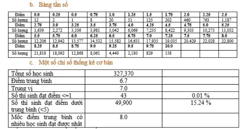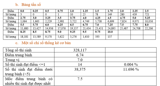 Năm nay cả nước có 328.117 thí sinh thi tốt nghiệp THPT môn Hóa. Trong đó, điểm trung bình thí sinh đạt được là 6,74, điểm nhiều thí sinh đạt được nhất là 7,5. Số thí sinh có điểm thi dưới trung bình là 38.375 người (chiếm tỷ lệ 11,7%).