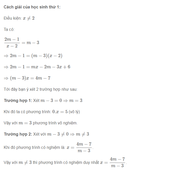 Nhìn và so sánh 2 lời giải trên đây, chúng ta biết, lời giải của học sinh thứ 2 chặt chẽ và đầy đủ hơn lời giải của học sinh 1. Vì thế mới có thể tìm được đầy đủ các giá trị của m để phương trình có nghiệm và vô nghiệm.