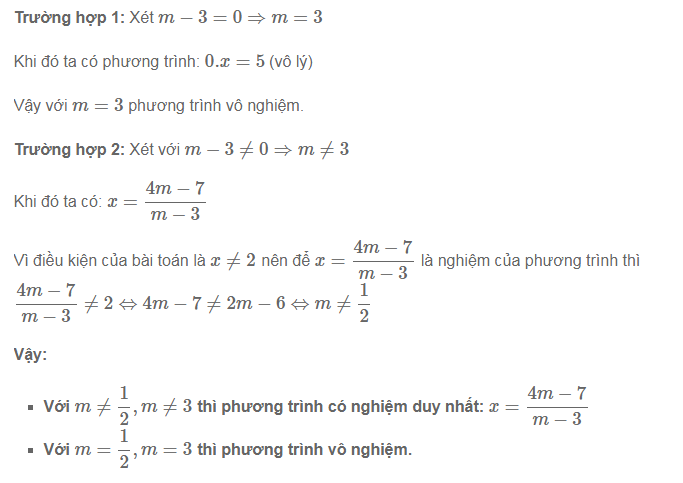 Câu trả lời là: Lời giải trên chưa chính xác, vì nếu chúng ta thay giá trị m=1/2 vào phương trình của đề bài - thì giá trị m này không thuộc tập nghiệm mà học sinh trên đã kết luận.